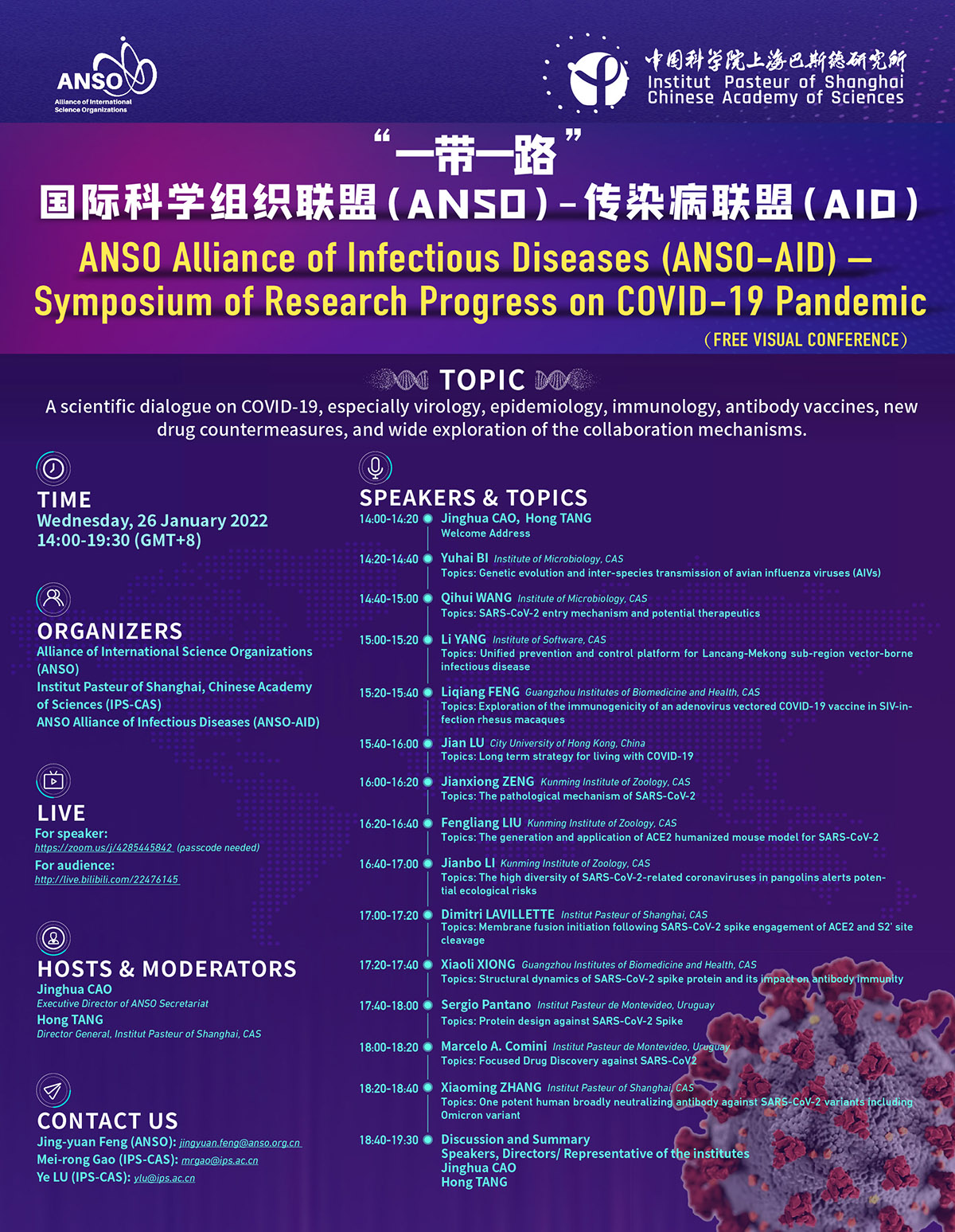 This free visual Symposium “ANSO-AID Research Progress on COVID-19 Pandemic” is jointly organized by the Alliance of International Science Organizations (ANSO) and to be hosted by the Institut Pasteur of Shanghai, Chinese Academy of Sciences (IPS) and ANSO Alliance of Infectious Diseases (ANSO-AID) on Wednesday January 26th, 2022 (14:00-19:30, Beijing Time).