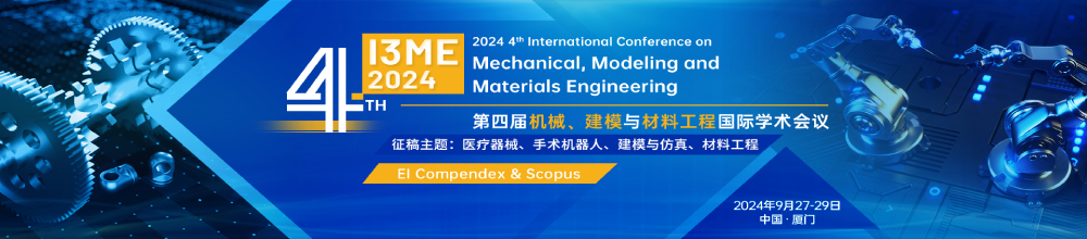 最新消息:经主办方商议决定第四届机械、建模与材料工程国际学术会议(I3ME 2024)将于2024年9月27日线上召开,具体议程及线上参会方式将于后续公布,敬请留意。参会人员无须前往线下,录用论文正常递交出版、EI检索,正常开具参会证明文件。