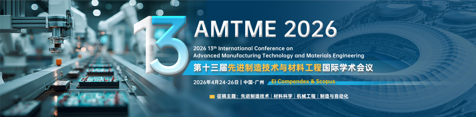 2026年第十三届先进制造技术与材料工程国际学术会议 (AMTME 2026) 定于2026年4月24-26日在中国广州隆重举行。会议主要围绕先进制造技术与材料工程等研究领域展开讨论。会议旨在为从事先进制造技术与材料工程研究的专家学者、工程技术人员、技术研发人员提供一个共享科研成果和前沿技术,了解学术发展趋势,拓宽研究思路,加强学术研究和探讨,促进学术成果产业化合作的平台。大会诚邀国内外高校、科研机构专家、学者,企业界人士及其他相关人员参会交流。