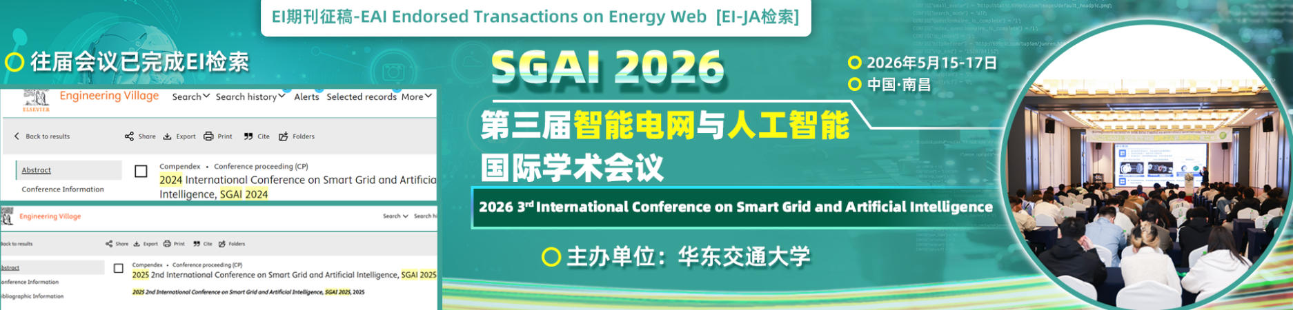 第三届智能电网与人工智能国际学术会议(SGAI 2026)将于2026年5月15-17日在南昌举办,由华东交通大学主办。会议主要围绕智能电网以及相关的人工智能技术展开讨论。大会旨在为从事相关行业的专家、科研学者、技术人员共享科研成果和前沿技术,让大家了解学术发展趋势,拓宽研究思路,加强学术研究和探讨,促进学术成果产业化。大会诚邀国内外高校、科研机构专家、学者,企业界人士及其他相关人员参会交流。