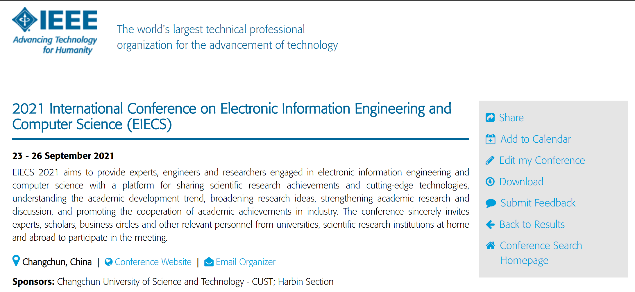 2021年IEEE电子信息工程与计算机科学国际会议将于2021年9月23-26日在中国·长春市隆重举行。会议由长春理工大学主办,长春理工大学电子信息工程学院、长春理工大学计算机科学与技术学院、AEIC学术交流中心承办,吉林大学、东北师范大学、长春工业大学、长春大学、东北电力大学、北华大学、四川大学、电子科技大学、上海交通大学、北京工业大学、华中科技大学、南京航空航天大学、青岛大学、山东理工大学、华南理工大学、南京理工大学、天津大学、武汉科技大学协办。会议旨在为从事电子信息工程和计算机科学的专家学者、工程技术人员、研发人员提供一个共享科研成果和前沿技术,了解学术发展趋势,拓宽研究思路,加强学术研究和探讨,促进学术成果产业化合作的平台。大会诚邀国内外高校、科研机构专家、学者,企业界人士及其他相关人员参会交流。